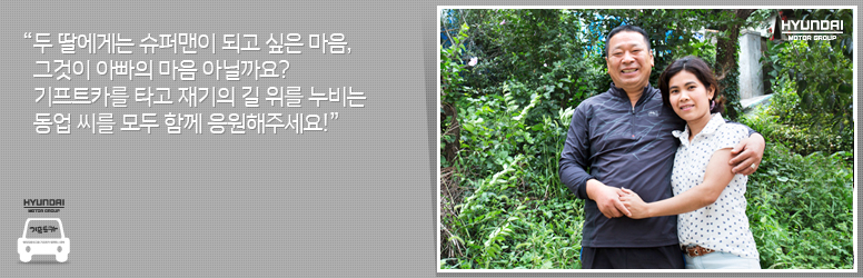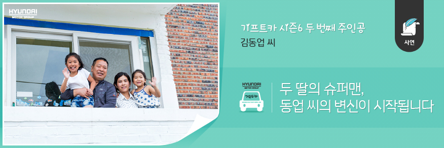 두 딸에게는 슈퍼맨이 되고 싶은 마음, 그것이 아빠의 마음 아닐까요? 기프트카는 가족의 꿈을 싣고 달리는 슈퍼맨 동업 씨의 화려한 변신에 힘을 실어줄 것입니다. 재기의 길 위를 누비는 동업 씨를 모두 함께 응원해주세요!