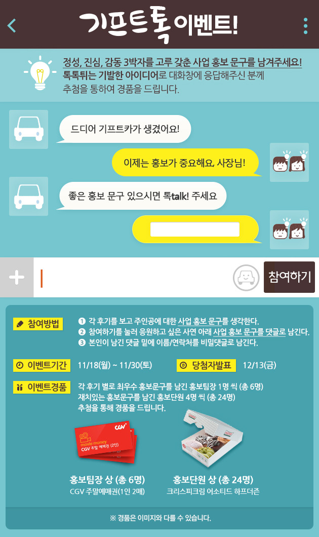 종료 [기프트톡 이벤트] 11월 주인공들을 위한 사업홍보문구를 남겨주세요!(마감) 2013-11-18 2504 0 11월 주인공과 함께 하는 돌아온 기프트톡 이벤트!정성과 진심, 감동까지 갖춘 사업홍보문구를기프트카 시즌4 11월의 주인공들을 위해 남겨주세요!톡톡튀는 기발한 아이디어의 홍보문구로 주인공들에게 힘이 되어 준 분들 중추첨을 통하여 선물을 드리니 많은 참여 부탁 드립니다^_^“참여하기” 버튼을 클릭하여 사업홍보문구를 제안해주세요! 목록