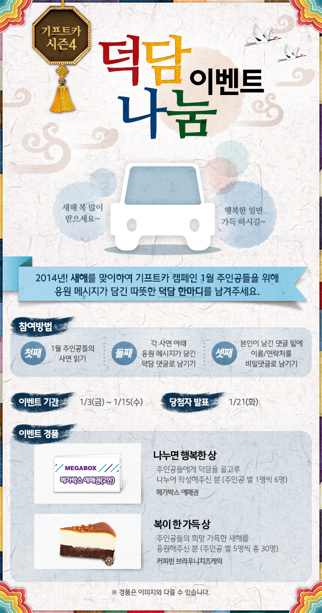 종료 [덕담나눔 이벤트] 새해맞이 기프트카 주인공들에게 덕담을 남겨주세요! (마감) 2014-01-03 2391 0 기프트카 시즌4 덕담나눔 이벤트!2014년 새해를 맞이하여 기프트카 캠페인 1월 주인공들에게응원 메시지가 담긴 덕담을 나누어주세요!주인공들에게 희망 가득한 덕담을골고루 나누어 작성해주신 분들 모두 후보 대상!많은 참여 부탁 드립니다. ^_^>> 기프트카 시즌4 덕담나눔 이벤트 참여하기 << 목록