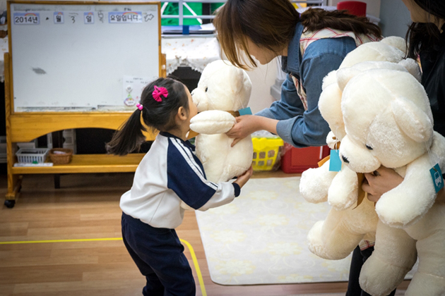 상자 속에서 하나 둘 나오는 자기 몸만한 곰인형을 보더니 잠잠하던 아이들은 자리를 박차고 일어나서 무척이나 좋아했습니다. 너도 나도 손을 들며 까치발까지 들던 아이들. 서로 먼저 안아 보겠다고 나서는 바람에 되려 다툼이 생기지 않을까 노심초사 했지만, 역시 아이들 마음을 잘 아시는 이주현 선생님의 자연스런 진행으로 한 명 한 명 아이들에게 곰인형을 안겨 주셨습니다. 남자 아이들 여자아이들 할 것 없이 곰인형 하나로 어찌나 해 맑게 웃던지... 선생님 말씀대로 인형을 받자마자 업고 다니려는 친구도 보이더군요.