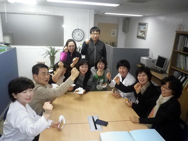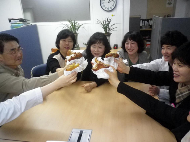 마침 복지관의 점심 시간이 끝나고 얼마 되지 않았을 때 도착한 튀김 소보로 상자를 보고 처음에는 직원들이 주저하는 모습을 보이는 가 싶더니, 어느새 김태경 씨의 소보로 맛을 보고 여기저기서 감탄사가 터져나옵니다.