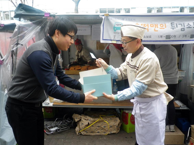 오늘은 기프트카 캠페인 선물 나눔 이벤트에 선정된 주인공 중 한 명이 직접 여의도에 있는 호떡맨의 튀김 소보로 가게에 찾아와 따끈하고 신선한 빵을 전달받기로 했습니다. 약속한 시간이 다가오자 부지런한 김태경 씨의 손놀림이 더 빨라집니다. 눈과 손은 튀김 소보로에 집중해 있지만 입가에는 미소가 사라질 줄 모릅니다.