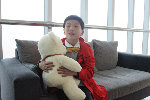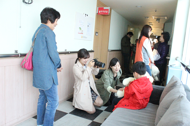 첫 번째 인형의 주인공은 눈웃음이 예쁜 형백이입니다. 물리치료를 받고 나오는 형백이에게 인형을 전달해 주자 웃음꽃이 활짝 핍니다.