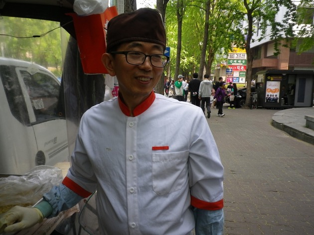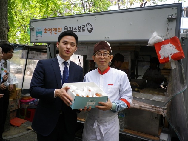 입맛을 당기는 고소한 튀김 냄새와 현대자동차그룹 기프트카 광고 덕인지 거리를 오가는 사람들의 시선이 머무는 곳, 오늘도 호떡맨 김태경 씨의 튀김 소보로 가게가 분주합니다. 기프트카 선물 나눔 캠페인 2차 당첨자들에게 전달할 튀김 소보로 준비에 여념이 없는 가운데 직접 소보로를 전달받을 주인공, 권준범 씨가 도착했습니다.
