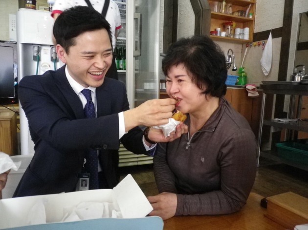 따끈한 튀김 소보로를 가지고 권준범 씨 부모님이 운영하시는 추어탕 식당에 도착했습니다. 때 마침 점심 시간이라 많은 손님들로 분주했습니다. 아들의 일이라면 언제나 발 벗고 나서는 부모님은 바쁜 시간에도 불구하고 아들을 반갑게 맞아주셨습니다. 업무 중 잠시 시간을 내어 들른 아들 권준범 씨도 양복 차림에 두 팔을 걷어붙이고 부모님을 도와 손님을 맞으며 바쁜 점심 시간 식당 일을 도왔습니다. 어느 정도 점심 시간이 마무리될 무렵 주방에서 함께 일하시는 아주머님들과 튀김 소보로를 나눠 드신 아버지 권정년 씨가 김태경 씨께 대표로 감사 인사를 전해주셨습니다.
