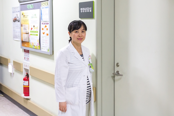 네, 안녕하세요. 이렇게 축하해 주셔서 너무 감사합니다. 이런 행운이 저랑 아기한테 올 줄 몰랐어요. (웃음) 저는 현재 본 병원에서 상담 영양사로 근무하고 있어요. 병원에 계시는 환자 분들은 제 각기 피해야 할 음식이나 섭취해야 할 음식들이 다른 경우가 많기 때문에 의사선생님들께서 환자 한 분 한 분의 식단 관리를 위해서 의뢰를 주시면 환자와 보호자 분을 직접 만나서 어떤 음식들을 드셔야 되고, 또 어떤 음식들은 피하셔야 하는지 설명 해드리고 교육하는 일을 하고 있어요. 요즘은 워낙 먹는 게 치료만큼이나 중요해져서 의뢰를 많이 주시는 편이예요.