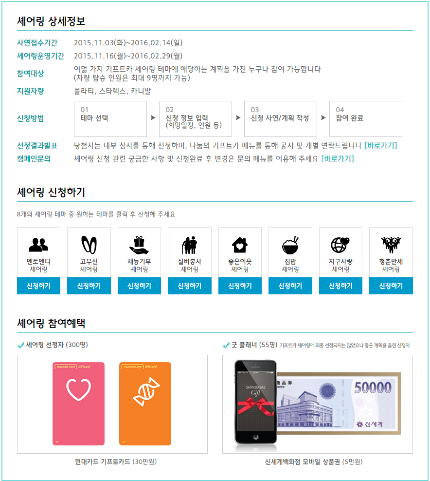 종료 함께타는 기프트카, 기프트카 셰어링 캠페인 기프트카 셰어링 누구나 이용할 수 있는 모두의 차 2015-11-03 1263202 1107 기프트카 셰어링누구나 이용할 수 있는 모두의 차함께타는 기프트카, 기프트카 셰어링 캠페인 #재능기부 #실버봉사 #좋은이웃 #집밥 #지구사랑 #청춘만세 #시즌6 #응원메세지 #셰어링 #셰어링캠페인 #멘토멘티 #고무신 목록