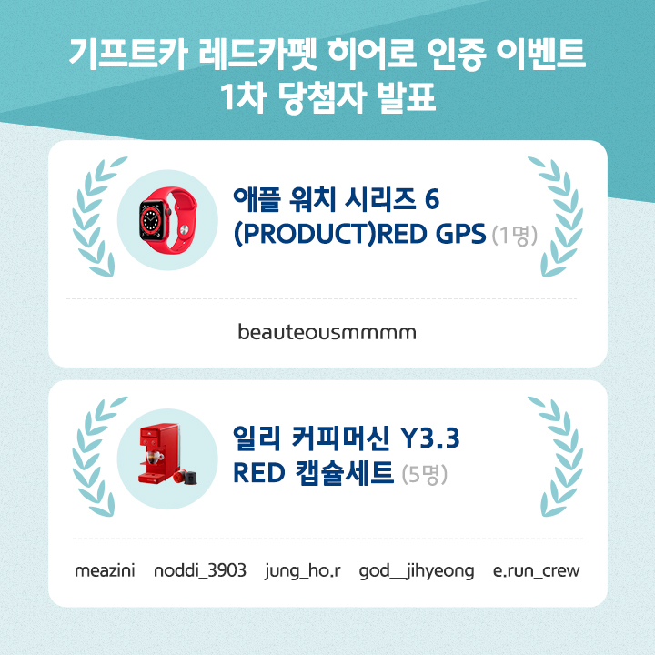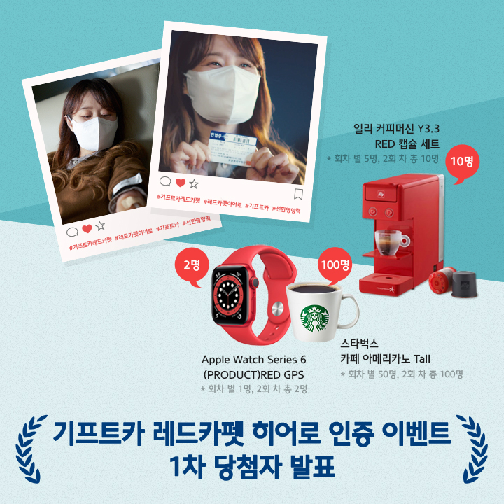 * 애플 워치 시리즈 6(PRODUCT) RED GPS, 일리 커피머신 Y3.3 RED 캡슐 세트 경품에 당첨되신 분에게는 별도 개별 연락 드릴 예정이며, 1/21(목)까지 연락이 되지 않을 경우 당첨이 취소 될 수 있습니다.