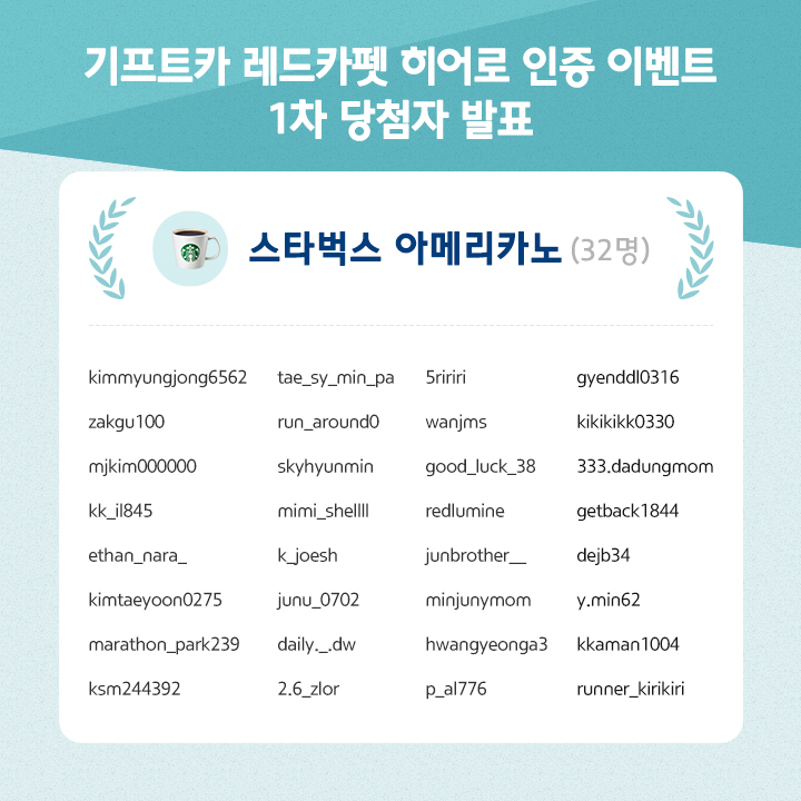 * 스타벅스 카페 아메리카노 경품은 발표일 기준 1주일 이내 입력하신 정보로 모바일 상품권으로 발송 될 예정이며, 개인 정보 입력 오류로 경품이 반송될 경우 재발송 되지 않습니다.