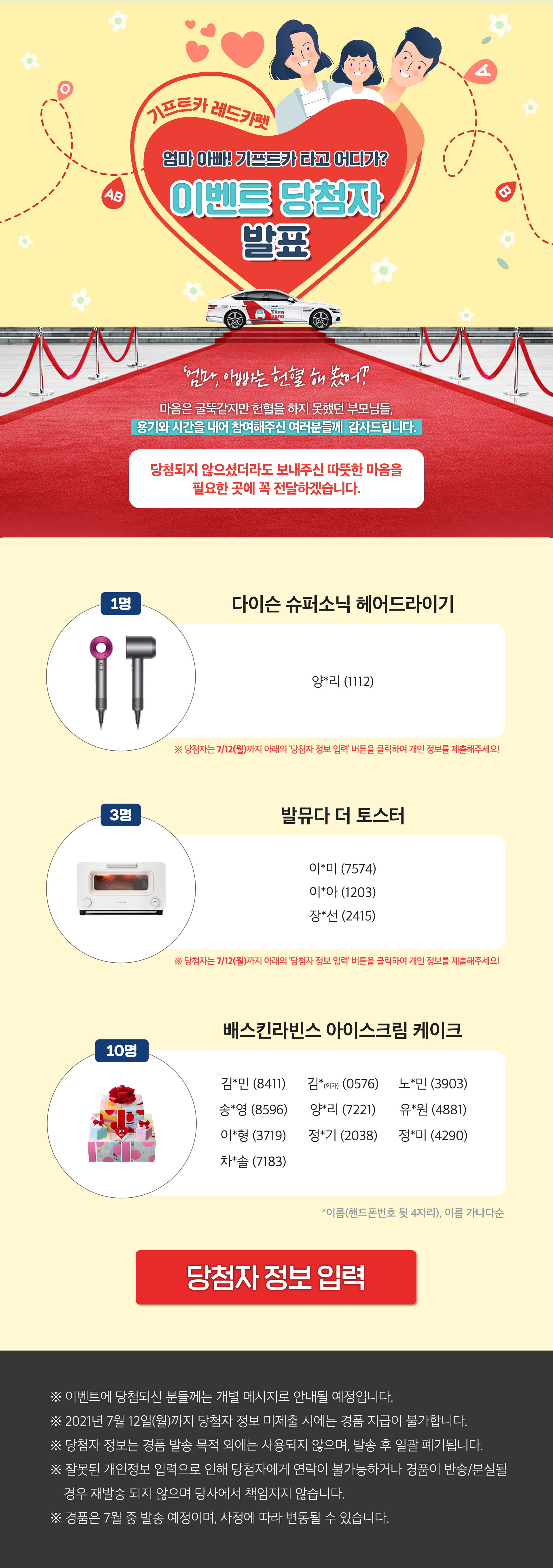 당첨자발표 [기프트카 레드카펫]엄빠 헌혈 나눔 이벤트 당첨자 발표 기프트카 레드카펫 엄빠 헌혈 나눔 이벤트에 참여해 주신 여러분들께 진심으로 감사드립니다. 보내주신 따뜻한 마음을 필요한 곳에 전달하겠습니다. 앞으로도 기프트카 레드카펫에 많은 관심과 참여 부탁 드립니다. 2021-07-09 259601 0 #현대자동차그룹 #기프트카 #레드카펫 #기프트카레드카펫 #헌혈 #사회공헌 #선한영향력 #엄빠헌혈나눔 #이벤트 #기프트카레드카펫이벤트 #당첨자발표 목록