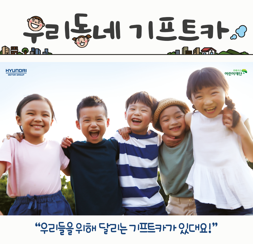 이웃의 자립을 도우며 사회에 온기를 더해온 현대자동차그룹의 장수 사회공헌사업, 기프트카 캠페인이 9번째 시즌을 맞았습니다. 전국민이 함께 했던 셰어링 캠페인, 청년 계층을 위한 청년 창업 캠페인을 이어 이번 시즌9에서는 아이들이 더 행복한 세상을 위한 ‘우리동네 기프트카’ 캠페인을 신설하였습니다.