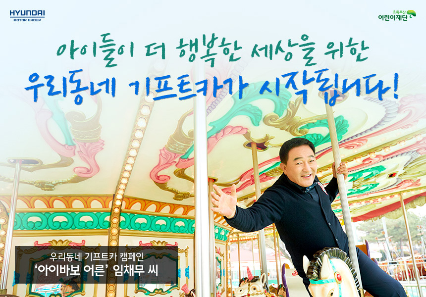 임채무 씨와 사랑스러운 아이들이 함께한 ‘아이바보 어른’ 영상이 궁금하지 않으신가요? 애정 가득한 임채무 씨와 해맑은 아이들의 모습을 확인하시고, 영상 공유 이벤트에 참여해 우리동네 기프트카 캠페인을 응원해주세요. 영상 공유에 적극적으로 참여하신 분들을 위한 혜택까지 준비되어 있다고 하니 많은 참여 부탁 드립니다.