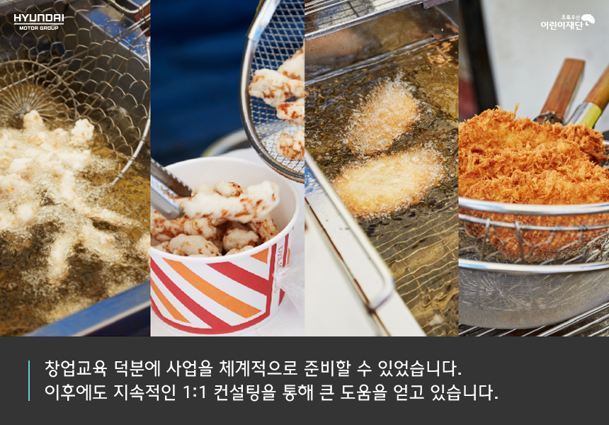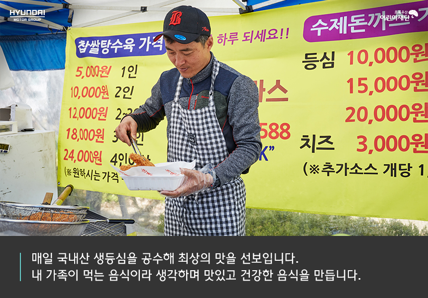 사업에 꼭 맞는 윙바디 탑차를 받은 덕분에 지난 1월부터 본격적으로 사업을 운영하고 있습니다. 평일에는 요일마다 아파트 장터를 이동하며 찹쌀탕수육과 수제돈가스를 판매하고 있습니다. 그리고 주말에는 다양한 플리마켓에 참여해 판매 활동을 펼치고 있습니다. 아침 7시부터 영업을 준비해 밤 10시 즈음 퇴근하고 있습니다. 피로한 감이 없지 않지만 감사한 마음으로 일하고 있습니다. 열심히 일한 덕분인지 단골손님도 조금씩 늘고, 사업도 자리를 잡아가고 있답니다.