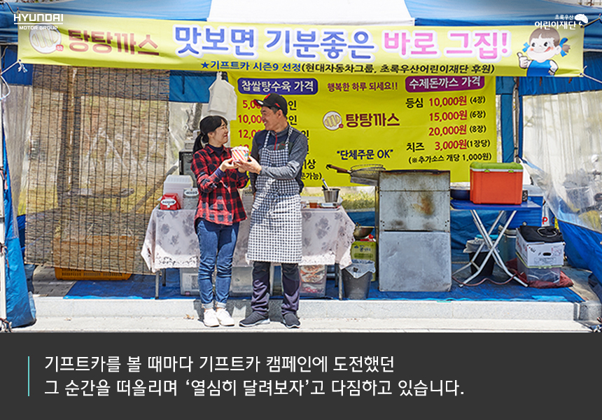 기프트카는 제게 ‘초심’을 되새기게 합니다. 차량을 볼 때마다 기프트카 캠페인에 도전했던 그 순간을 떠올리며 '열심히 달려보자'고 다짐하곤 합니다. 덧붙여 이 자리에 오기까지 도움을 주신 많은 분께 보답하고 싶습니다. 사업에 성공해 주변에 나누며 살아가는 사람이 되려고 합니다.