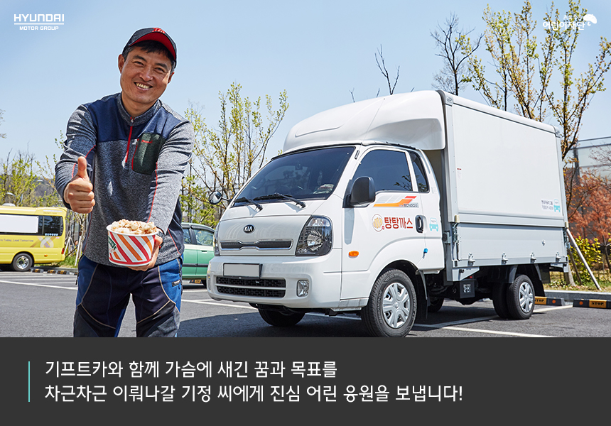 초심을 잃지 않고 열심히 나아가겠다는 각오를 밝힌 기정 씨에게서 굳은 의지가 느껴졌습니다. 기프트카와 함께 가정의 행복을 조금씩 키워나가고 싶다는 기정 씨. 가슴에 새긴 꿈과 목표를 차근차근 이뤄나갈 기정 씨에게 힘찬 응원을 보냅니다!