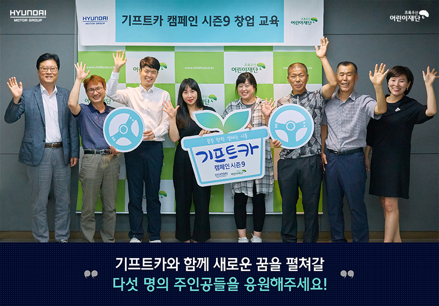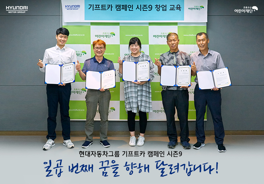 기프트카 캠페인 시즌9는 차량 지원뿐 아니라 창업자금, 창업교육, 컨설팅 지원을 통해 주인공들의 도전이 열매 맺을 수 있도록 맞춤형 창업을 지원합니다. 주인공들의 열정만큼 뜨거운 햇살이 내리쬐던 지난 7월, 기프트카 캠페인 시즌9의 마지막 주인공들이 2박 3일간의 창업 교육을 마쳤습니다. 주인공들을 축하하기 위해 수료식장을 찾은 이병훈 현대자동차그룹 상무와 김진월 초록우산 어린이재단 본부장이 축하 메시지를 전했습니다.