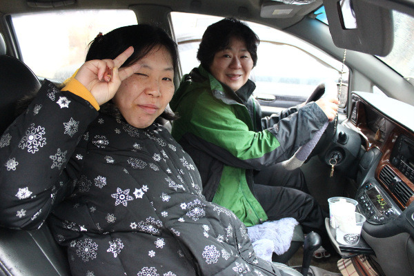 [과일 판매에 나서는 박정숙 씨 모녀(위) / 판매에 활용되는 정숙 씨의 승용차(아래)]
