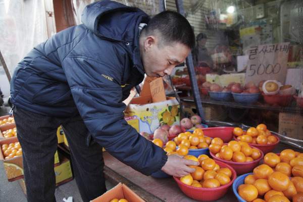 [인근 소매점에서 판매되는 과일의 상태를 꼼꼼히 체크하는 모습]