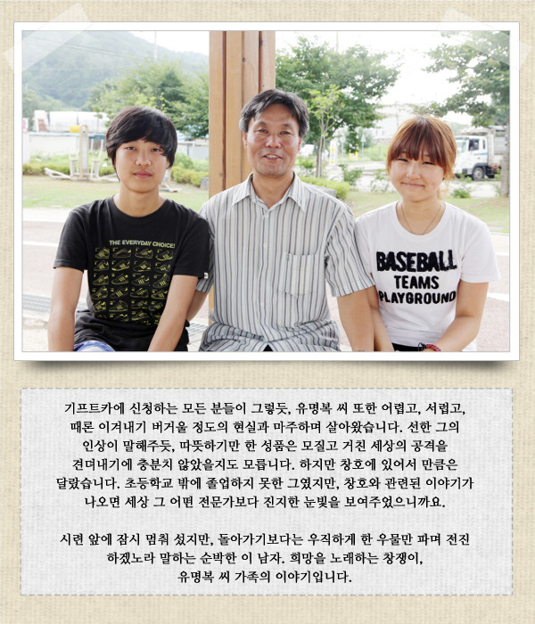 유명복 씨는 2000년 IMF로 부도를 맞게 되면서부터 인천강화지역자활센터에서 일을 해왔습니다. 힘든 상황에 많이 좌절했지만 그때마다 특유의 우직하고 성실한 성격으로 자활센터에서 창호 일을 계속했습니다. 그러던 와중 자활센터에서 같이 일하던 양경애 씨(기프트카 시즌3 주인공)를 보며 진심 어린 축하와 함께 '나도 꼭 한번 도전해보고 싶다'는 생각을 하게 되었다고 합니다.