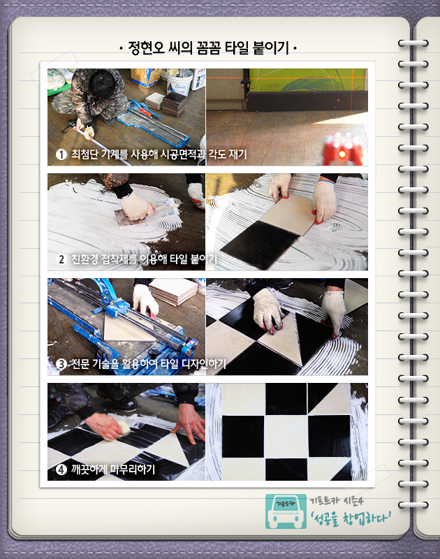 꼼꼼하고 빈틈없는 성격의 정현오 씨는 공사만 시작하면 단 하나의 하자도 용서하지 않는 완벽주의자로 변신한다고 합니다. 정교한 작업의 집수리가 끝난 후에도 고객들에게 이 정도면 충분하다는 이야기를 들어야만 그제야 허리를 펴는데요. 기프트카와 함께 본격적으로 인테리어 사업을 시작한 정현오 씨는 자신에게 이보다 더 찰떡궁합인 일은 없다고 말합니다. 행복한 웃음이 퍼지던 정현오 씨의 공사 현장으로 함께 들어가 볼까요?