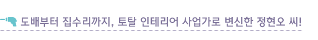 정현오 씨: 저는 인테리어도 하나의 작품이라고 생각해요. 모든 과정이 저의 손길을 거치는 만큼 제가 어떤 마음을 가지고 작업하느냐가 결과물에 큰 영향을 미치거든요. 사람들은 그저 평범한 집수리라고 생각할지도 모르지만, 저에게 집수리는 하나의 작품이자 사람들의 행복한 삶을 지어주는 뜻 깊은 일이에요. 그래서 상호도 행복짓기 인테리어로 지었죠.