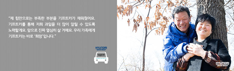 “기댈 수 있는 언덕을 만들어 주셔서 감사해요. 제 힘만으로는 부족한 부분을 기프트카가 채워줬어요. 기프트카를 통해 저희 과일을 더 많이 알릴 수 있도록 노력할게요. 앞으로 진짜 열심히 살 거예요. 우리 가족에게 기프트카는 바로 ‘희망’입니다.”