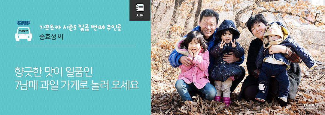송효성 씨는 누구보다 자신 있는 과일 판매업을 통해 기프트카의 첫 시동을 준비합니다. ‘내 아이에게 먹인다’는 생각으로 맛있고 질 좋은 과일을 소개하고 싶다는 효성 씨. 오늘도 목청 높여 과일을 알리면서 그의 진정성을 손님들에게 전하고 있습니다.