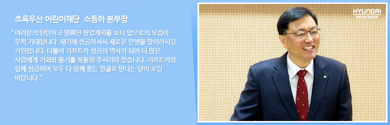 축하행사에는 현대자동차그룹의 이병훈 이사와 초록우산 어린이재단의 소동하 본부장이 함께 자리해 주인공들에게 아낌없는 격려와 응원을 보냈습니다.