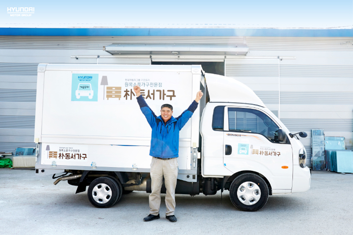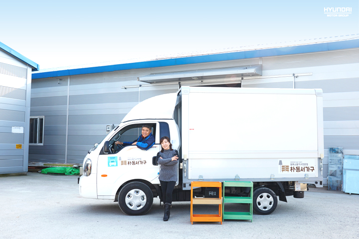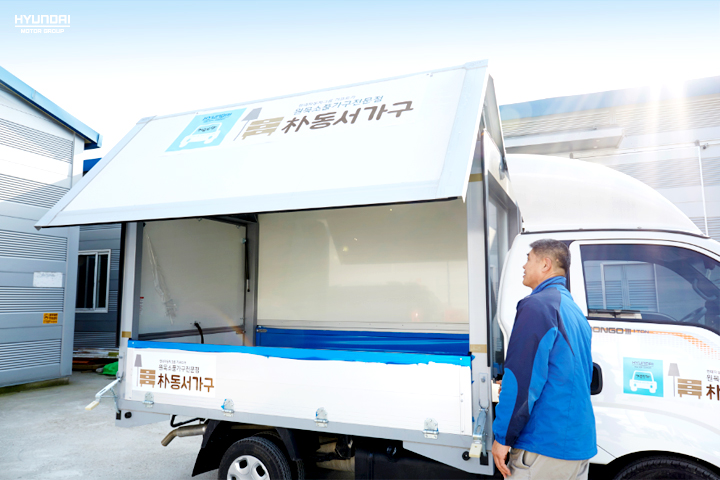 저와 함께할 기프트카는 윙바디 차량이에요. 비나 눈에 쉽게 손상되는 원목 가구를 걱정 없이 실어 나를 수 있어 안심이죠. 또 탑차를 날개처럼 펼쳐 언제 어디서든 판매를 할 수 있기 때문에 제품을 따로 옮겨야 하는 수고로움도 덜었어요.