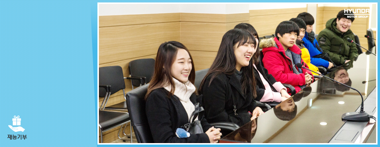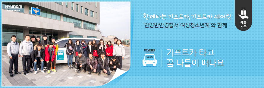 현대자동차그룹의 누구나 신청하고 이용할 수 있는 모두의 차 '기프트카 셰어링'과 함께하는 행복한 이야기가 하루하루 늘어가고 있습니다. 좋은 생각까지 나누는 착한 자동차 기프트카와 함께하는 재능기부 활동을 통해, 청소년들의 꿈과 희망도 쑥쑥 자라납니다.