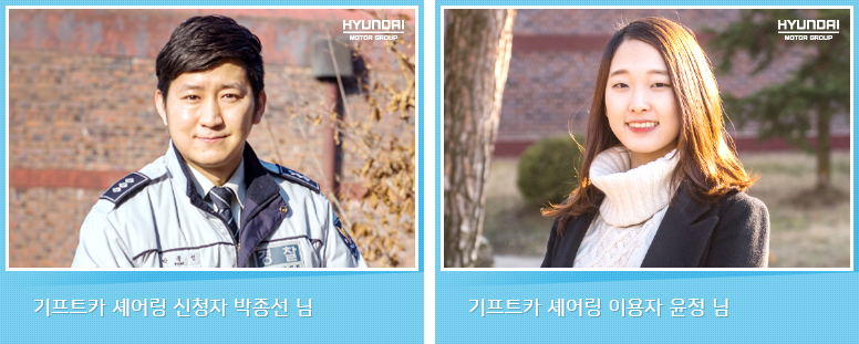 이처럼 기프트카와 함께 따뜻한 추억을 만들고 싶은 분이 있으신가요? 기프트카 셰어링은 2016년 2월 말까지 이어집니다. 참여 신청은 2월 14일까지 가능합니다. 멘토멘티, 고무신, 재능기부, 실버봉사, 좋은 이웃, 집밥, 지구사랑, 청춘만세 등 8개 셰어링 테마에 해당하는 사연이 있다면, 지금 신청하세요. 기프트카와 함께하는 행복을 더 많은 분과 나누고 싶습니다.