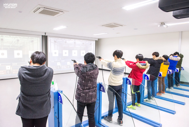 이제는 직접 연습을 해볼 차례겠죠. 커다란 스크린을 통해 다양한 상황이 연출됩니다. 배운 대로 목표물을 조준하지만, 첫 경험이다 보니 생각처럼 조준이 쉽지 않습니다. 하지만 이때도 남다른 재능을 발휘해 고득점을 올리는 학생들도 보입니다.