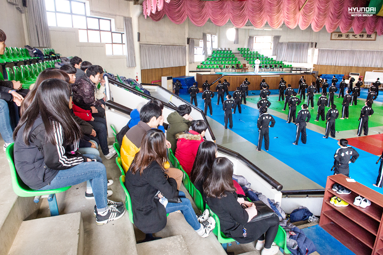 현장견학 마지막 순서는 무도 훈련 참관입니다. 커다란 체육관에서 도복을 입고 우렁차게 합기도를 연습하는 모습이 그야말로 장관입니다. 이전에 접하지 못했던 다양한 훈련 과정을 본 학생들은 저마다 인상적인 장면을 이야기하며 설렘을 감추지 못합니다. 담당 경찰관들도 좋아하는 학생들의 모습에 보람찬 미소를 짓습니다.