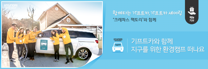 현대자동차그룹의 ‘기프트카 셰어링’이 전국 방방곡곡 행복한 기운을 전하고 있습니다. 누구나 신청하고 이용할 수 있는 모두의 차, ‘기프트카 셰어링’은 멘토멘티, 고무신, 재능기부, 실버봉사, 좋은 이웃, 집밥, 지구사랑, 청춘만세 등 8개의 셰어링 테마에 해당하는 활동 계획을 가지고 있다면 세대를 넘어 모두에게 열린 기회를 제공하고 있습니다. ‘기프트카 셰어링’과 소중한 추억을 만들고 싶은 분들은 2월 14일까지 사연을 신청해 주세요!