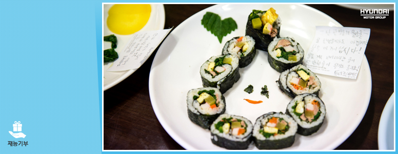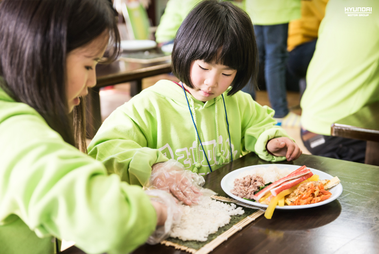 이윽고 식사시간. 환경캠프이니만큼 식사도 남다르게! 지구온난화로 바다 온도가 오르면서 어려움에 처하고 있는 우리나라 김 양식의 현주소를 알아보고, 꿈나무들의 몸과 마음을 튼튼하게 해줄 건강한 식재료로 만드는 ‘크레파스 환경 김밥’ 프로그램. 아이들은 생전 처음 스스로의 힘으로 김밥을 싸며 더없이 즐거워했고, 언니 오빠들에게 김밥을 먹여주며 나이를 초월한 우정과 사랑이 새록새록 샘솟았답니다. 김밥으로 잠자리, 물방울, 나무 등을 표현하며 환경보호를 다짐하기도 했지요.