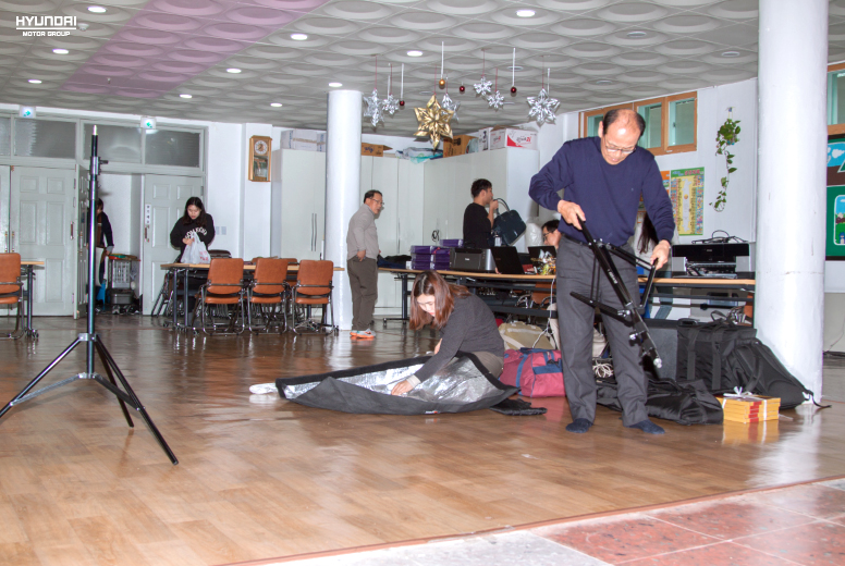 봉사단들은 각 구역별로 필요한 장비를 준비합니다. 준비를 하는 도중에 들리는 가족들의 기분 좋은 목소리와 웃음소리가 촬영장에 활기를 더해 갑니다.