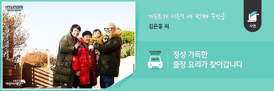 출장 요리를 찾는 이들이 늘어나고 있지만 매번 차를 빌려야 하는 불편함 때문에 은홍 씨는 고민이 많았습니다. 은홍 씨의 안타까운 사연을 전해들은 지인이 기프트카를 소개해주면서 은홍 씨는 안정적인 사업을 위한 발판을 마련할 수 있게 되었습니다.