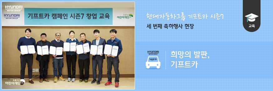 "먼저 어려운 과정을 거쳐 기프트카의 주인공이 되신 여러분 축하합니다. 기프트카의 창업 교육이 앞으로 여러분의 삶에 어려움이 닥칠 때 마다 이겨낼 수 있는 힘이 되기를 바라며, 기프트카를 통해 그동안의 좌절을 새 희망으로 바꾸는 기회가 되기를 기원합니다."