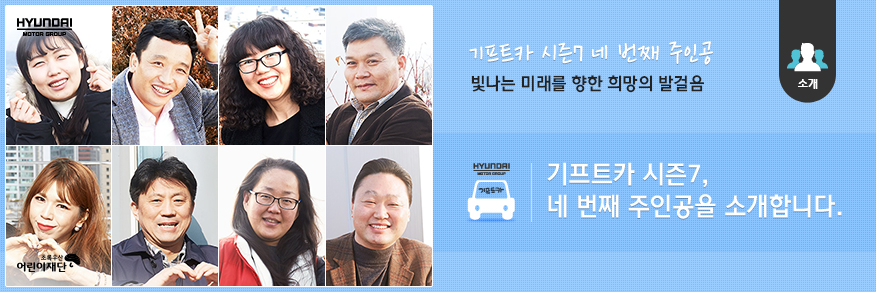 지금까지 기프트카 캠페인 시즌7의 네 번째 주인공들을 모두 만나보았습니다. 기프트카를 통해 소중한 인생의 전환점을 맞이한 주인공들에게 더욱 힘찬 응원의 목소리를 전해주세요!