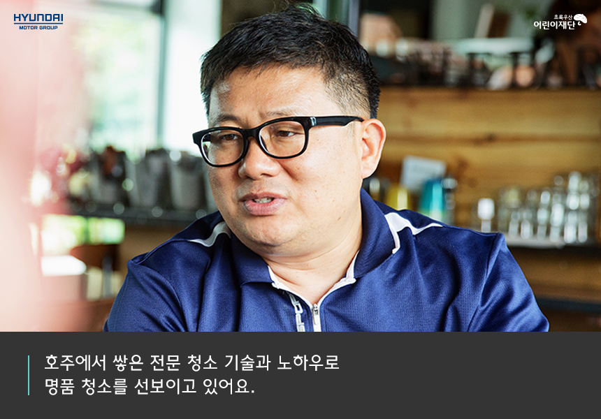 자세한 사연을 말씀 드리긴 어렵지만, 호주에서 잘나가던 대표에서 하루아침에 빈털터리가 되어 귀국하게 됐어요. 공장 노동자를 비롯해 여러 일을 하며 가족의 생계를 위해 열심히 살았죠. 고용주부터 고용자까지 모두 겪어보고 또 쓰라린 실패와 가난을 겪은 후 창업하면서 ‘직원과 더불어 잘사는 회사’를 만들어야겠다는 생각을 했습니다. 그래서 직원들이 덜 힘들도록 청소의 효율성을 높이려고 하고 있고, 팀 워크가 중요한 업이기 때문에 직원 교육에도 신경을 많이 쓰고 있어요.