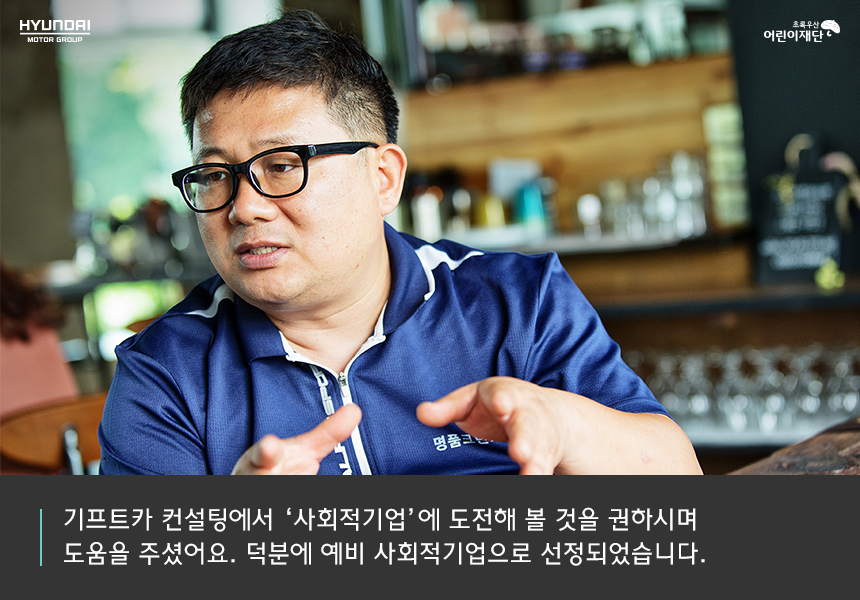 지금은 기프트카 컨설팅에서 조언해 주신 덕에 예비 사회적기업으로 선정 되었는데요, 사회적기업으로 선정되면 공공기관 및 지자체의 청소 용역 입찰 때 혜택을 받을 수 있습니다. 열심히 노력해서 하루 빨리 ‘예비’ 꼬리표를 떼고 당당하게 사회적기업 ‘명품크린 M&F’로 성장하려고 합니다. 그렇게 되면 회사의 매출도 늘고 직원들의 수입도 안정적으로 올라가며 힘은 덜 들게, 월급은 두둑하게 받을 수 있는 환경이 만들어 지겠죠?