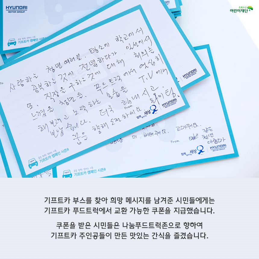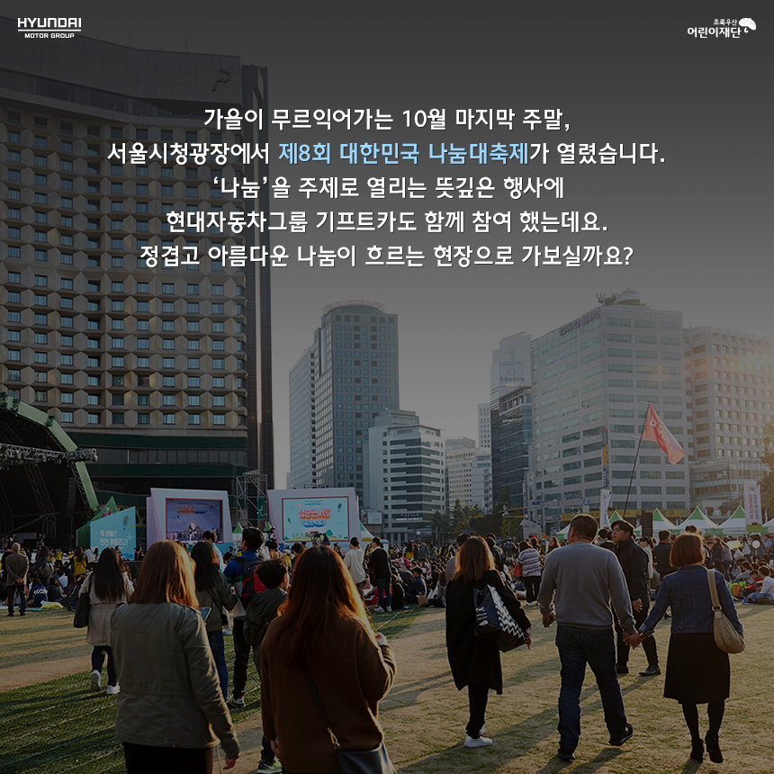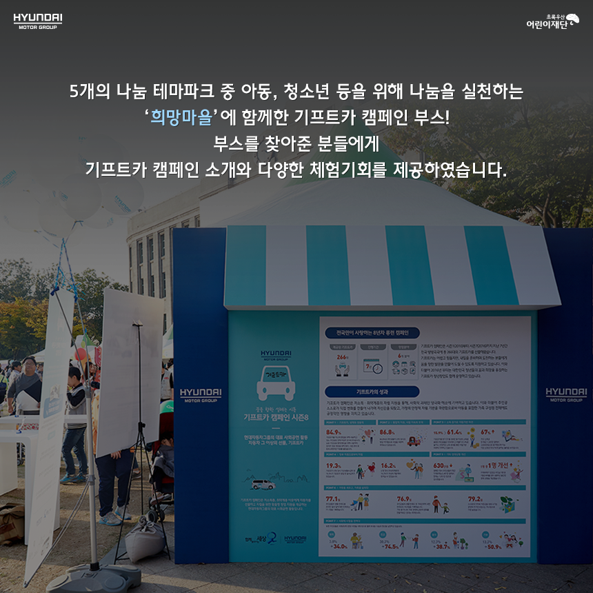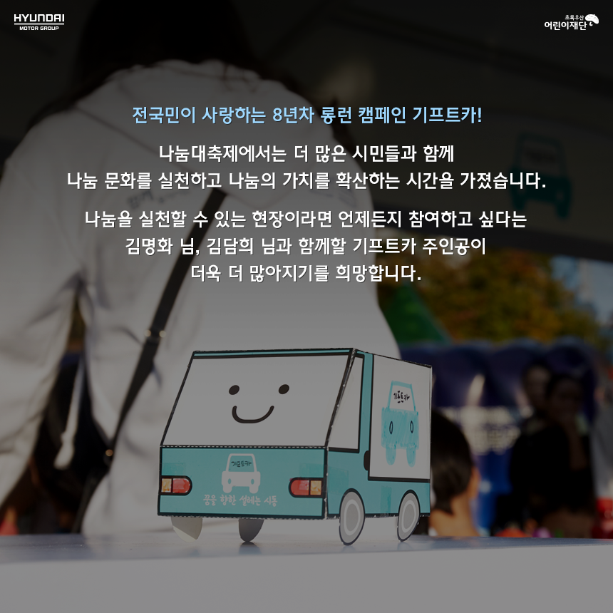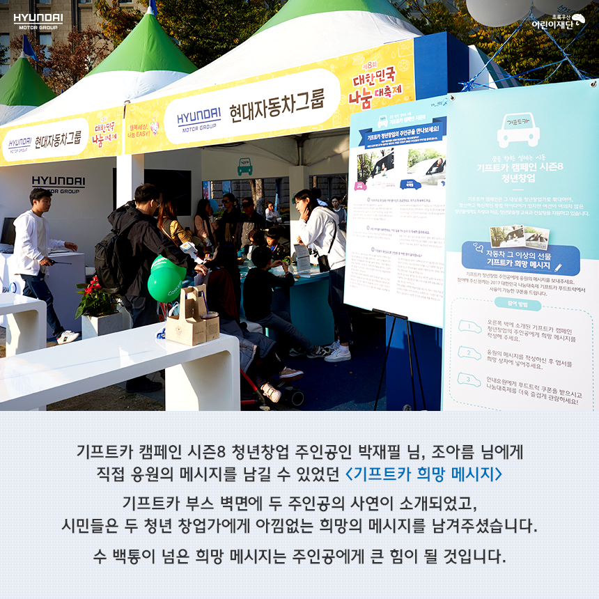 시즌8 [SPECIAL] 나눔대축제에서 만난 기프트카 가을이 무르익어가는 10월 마지막 주말 서울시청광장에서 나눔대축제에 참여한 기프트카 캠페인을 만나보았습니다! 2017-11-07 50887 5 #기프트카 #기프트카캠페인 #기프트카시즌8 #시즌8 #나눔대축제 #대한민국나눔대축제 #현대자동차그룹 #현대자동차그룹사회공헌 목록