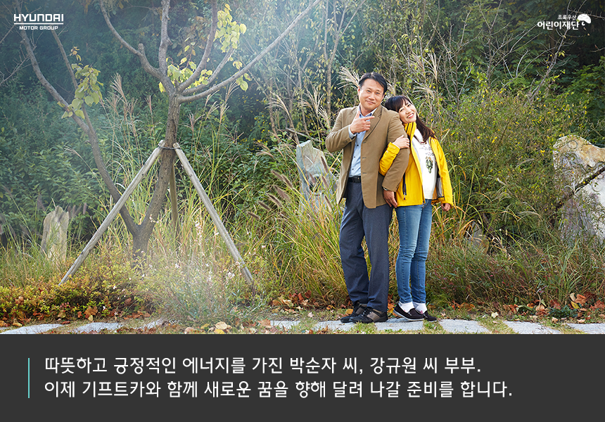 아울러 나이가 많다고, 경험이 적다고 기프트카에 지원하는 것을 주저하고 있다면 적극 도전해보라고, 자립에 대한 확고한 의지가 있다면 길이 있을 것이라는 말을 남겼습니다. 따뜻하고 긍정적인 에너지를 가진 박순자 씨와 강규원 씨 부부는 바로 지금, 기프트카와 함께 새로운 꿈을 향해 달려 나갈 준비를 합니다. 두 사람의 아름다운 내일을 지켜봐 주세요!