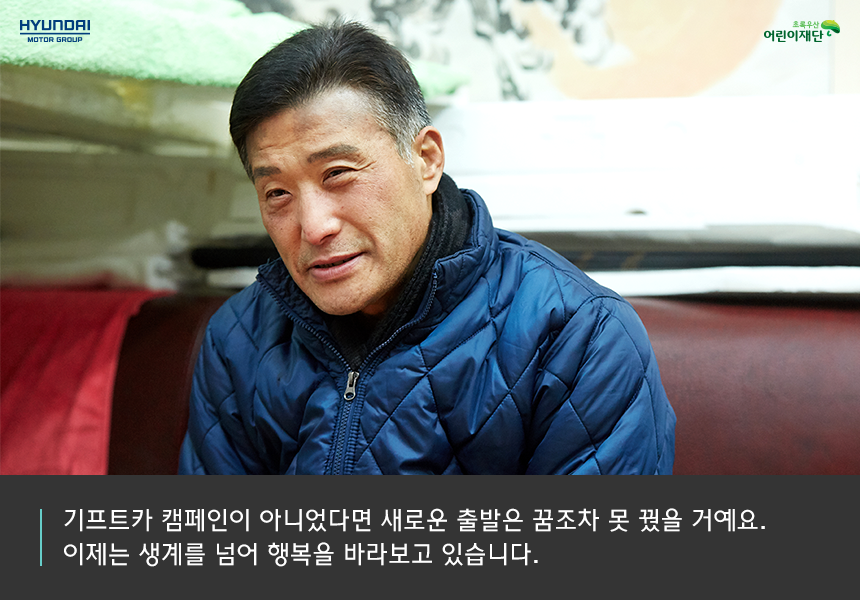 삶의 벼랑 끝에 서 있을 때 기프트카 캠페인을 만났습니다. 할 수 있는 일이 아무 것도 없었고, 건강도 악화되어 희망이 없을 때였습니다. 만약 지원 받지 못 했다면 지금 뭘 하고 있을지 상상도 가지 않습니다. 제게 기프트카는 희망을 다시 찾아 준 천사와 같아요.