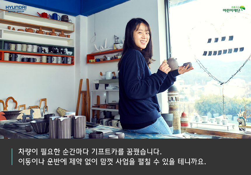 기프트카와 함께 새로운 출발선에 선 윤영 씨의 가슴은 설렘과 기대로 가득 차 있습니다. 자신만의 빛깔로 꿈을 빚어나갈 윤영 씨의 도전을 기대해주세요!