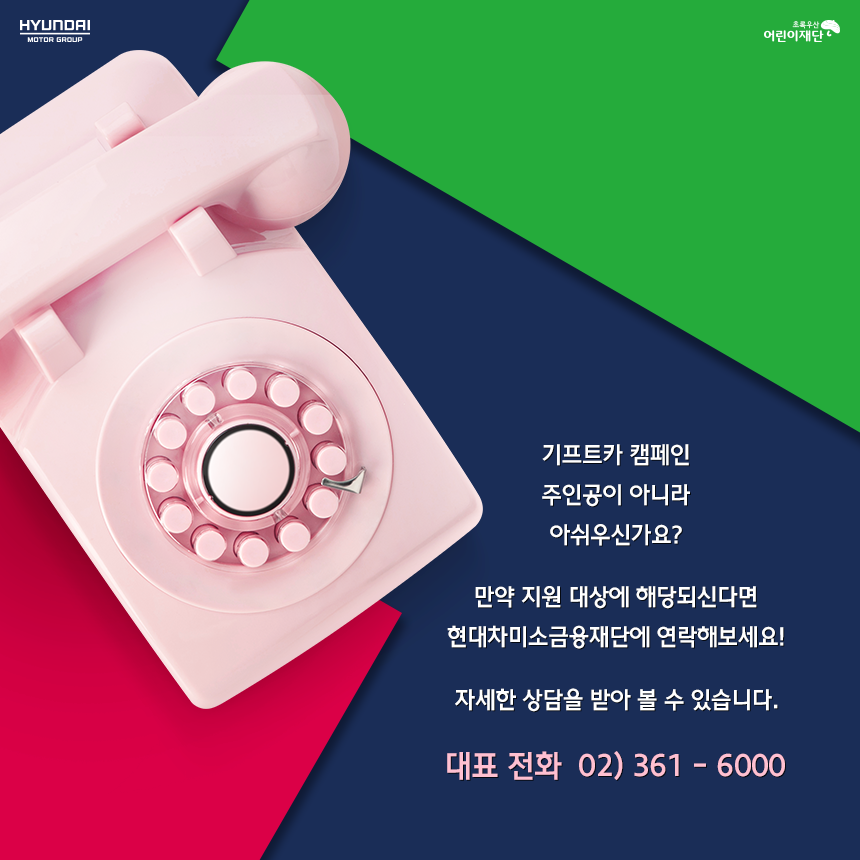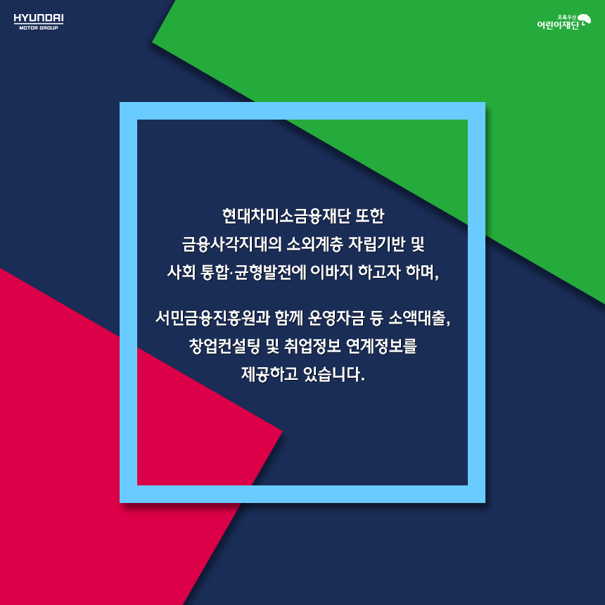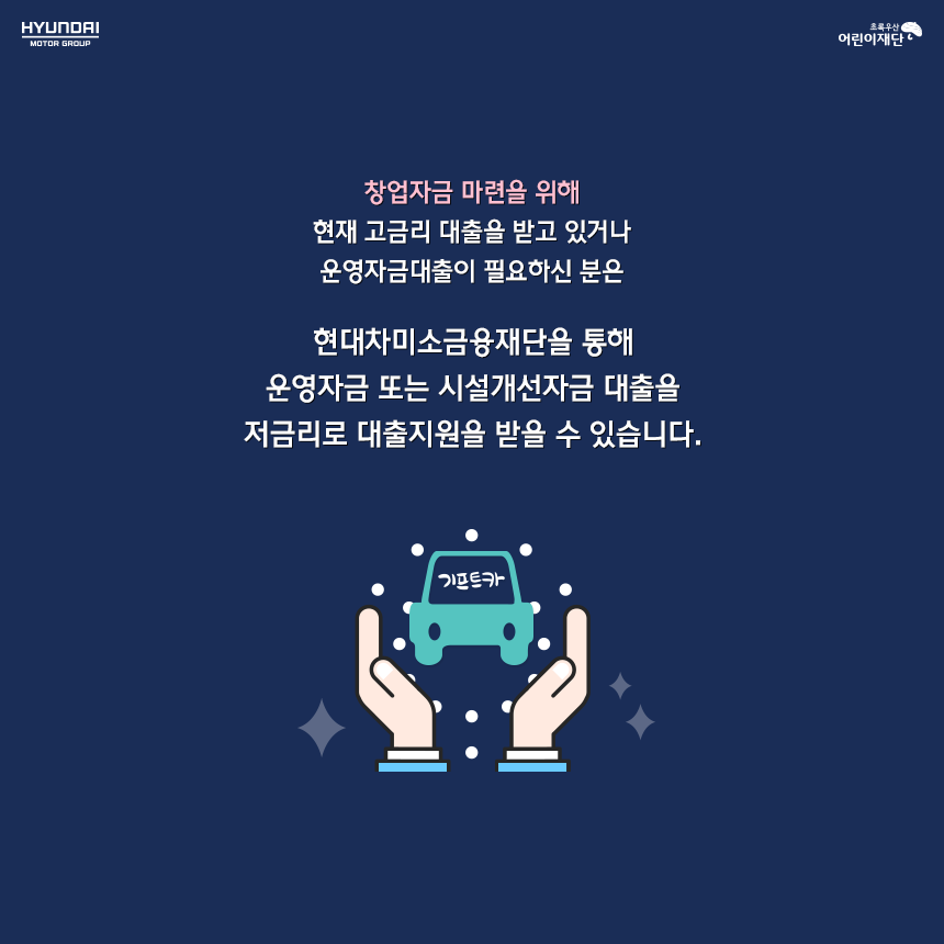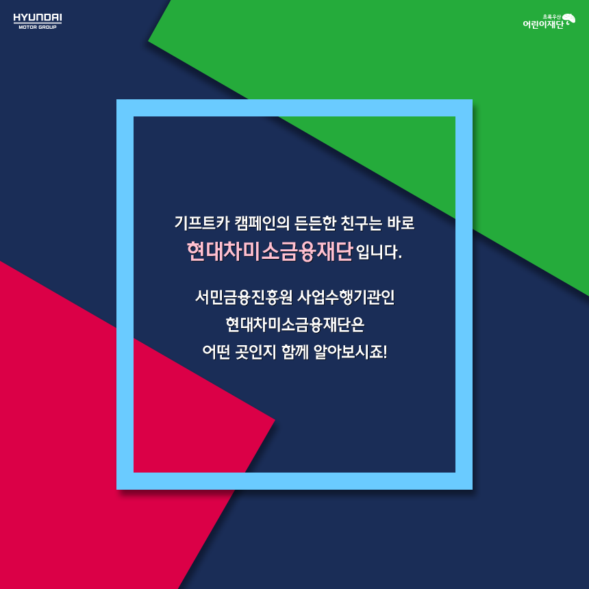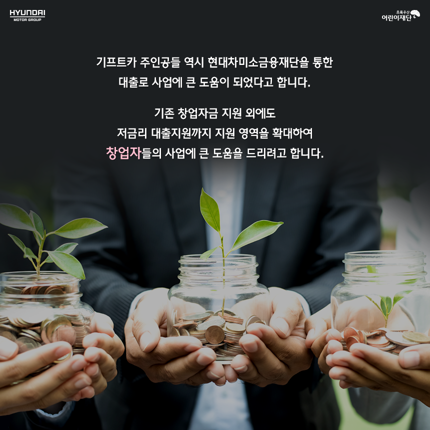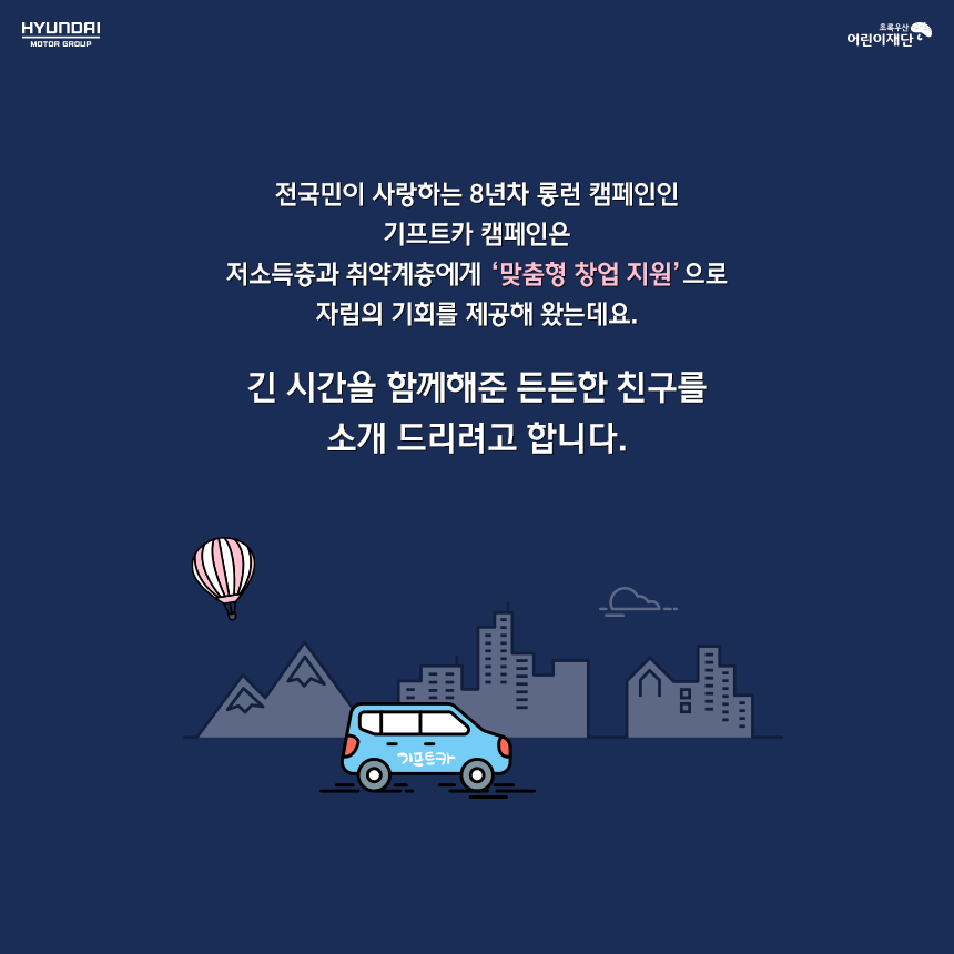 시즌8 [SPECIAL] 현대차미소금융재단을 소개합니다! 전국민이 사랑하는 8년차 롱런 캠페인 기프트카 캠페인의 긴 시간을 함께해준 든든한 친구 현대차미소금융재단은 어떤 곳일까요? 2018-04-24 51207 1 #기프트카캠페인 #기프트카 #시즌8 #현대차미소금융재단 #미소금융 #일반창업 #청년창업 #현대자동차그룹 목록