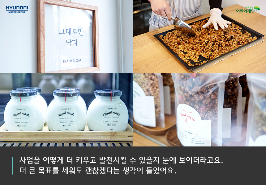 창업교육과 컨설팅을 통해 사업에 대한 마음가짐이 완전히 바뀌었어요. 점포 입지, 상권 수업을 듣고, 지금까지 두 차례 있었던 컨설팅을 지나면서 매장의 문제점이나 개선점도 알게 되고, 어떻게 해야 발전시킬 수 있을지 눈에 보이기 시작했습니다. 전에는 땡스오트를 동네 작은 카페 정도로만 여기고 있었지만, 지금은 저희만의 요거트와 그래놀라를 제조·유통할 수 있는 통로로 만들겠다는 꿈을 품고 있습니다. 언젠가는 프랜차이즈 매장을 낼 정도로요. ‘우리도 할 수 있다’라는 걸 깨달았거든요.