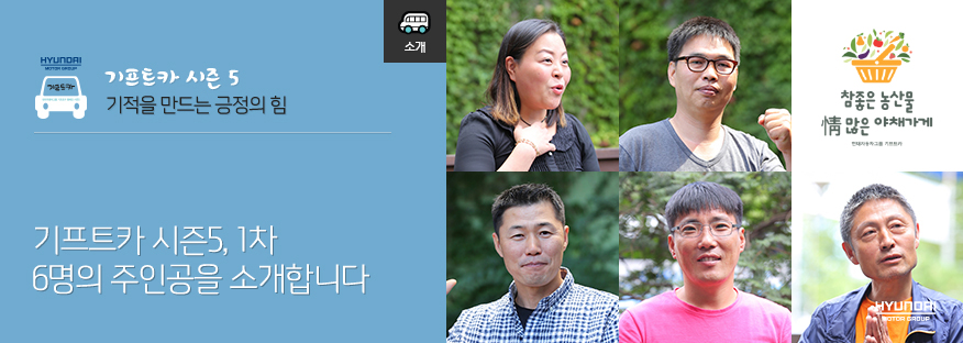 지금까지 기프트카 시즌5 첫 번째 주인공들을 만나봤습니다. 주인공들에게서 뿜어져 나오는 긍정적인 에너지가 느껴지시나요? 앞으로 힘차게 달려갈 기프트카 시즌5! 많은 응원과 관심 부탁드립니다.