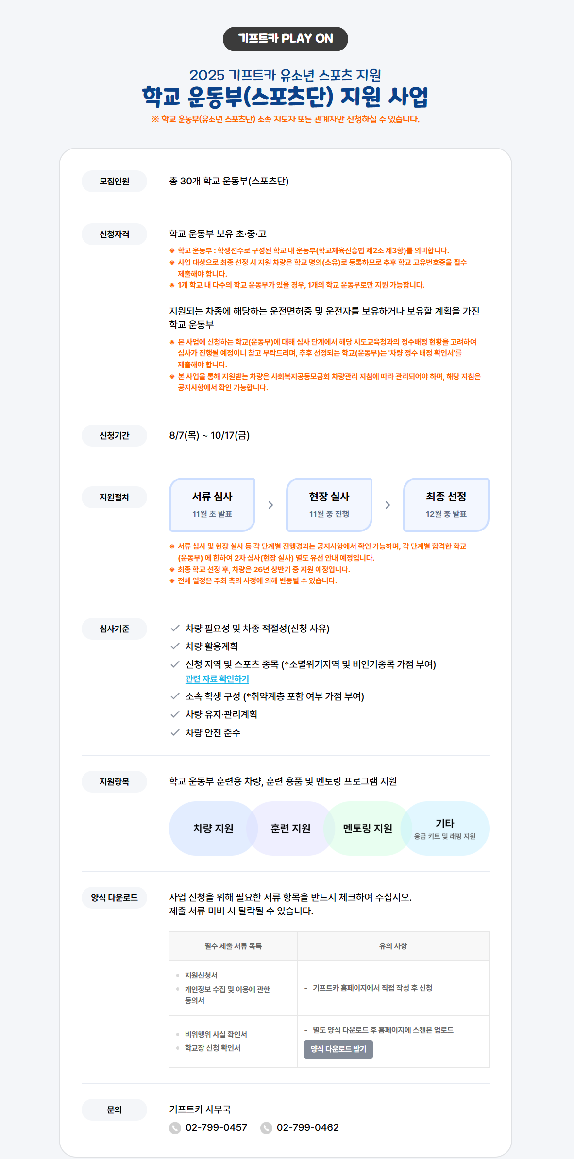 기프트카 PLAY ON 2025 기프트카 유소년 스포츠 지원 학교 운동부(스포츠단) 지원 사업 ※ 학교 운동부(유소년 스포츠단) 소속 지도자 또는 관계자만 신청하실 수 있습니다.