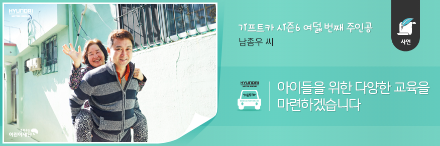 종우 씨는 사업을 통해 가족을 부양할 탄탄한 경제적 기반을 갖추고 싶다는 소망도 덧붙였습니다. 가슴에 품어온 꿈을 이루기 위해 쉼 없이 달려갈 종우 씨를 기대해주세요!